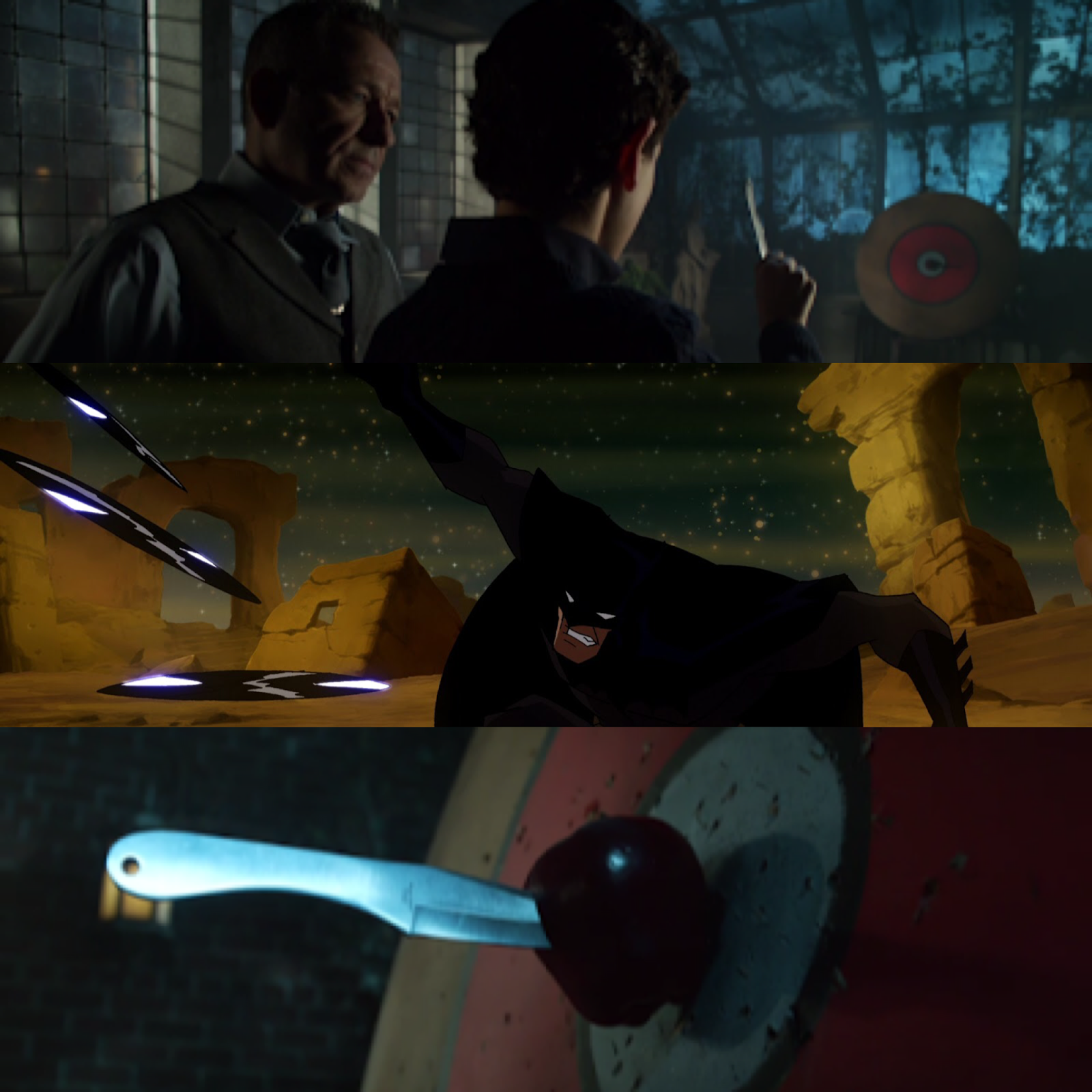 | Watching Bruce attempt to master the art of knife throwing while under pressure is a nice nod to the future cape crusader's arsenal of non lethal bat shaped throwing knives. |
